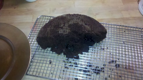 Forty minutes later, I begin to smell chocolate wafting up the stairs so I race back down to the kitchen to pull the cake out of the oven.  It’s… well… a bit wonky looking.  The fudge “swirls” have turned rather extraterrestrial and the entire thing looks more like the surface of the moon than a birthday cake.