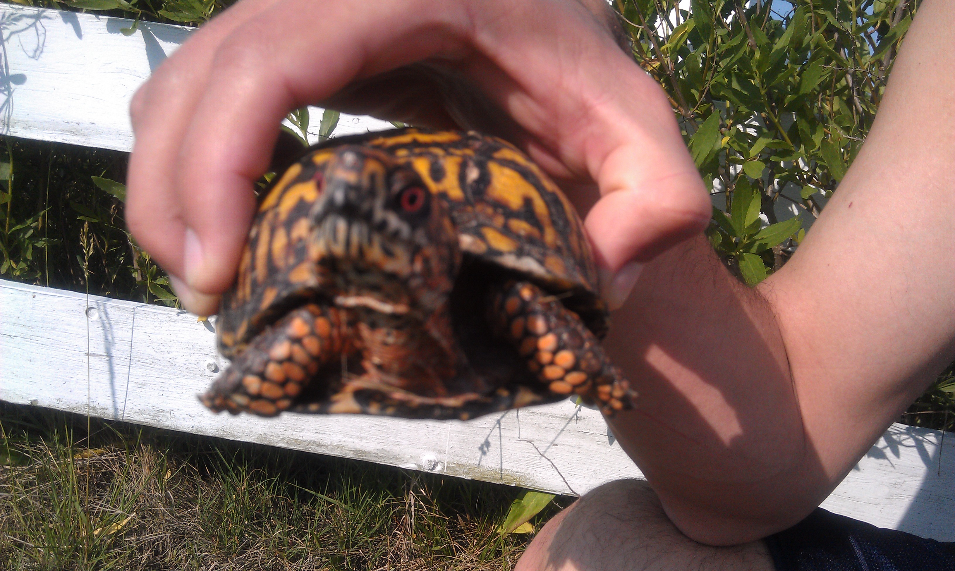 “There’s a turtle in the yard,” I explained. “And it’s trying to crawl into the pen with the dogs. It needs you!” (In case you’ve forgotten, the smaller of our two mutts can be quite the menace and the larger one isn’t much better…)