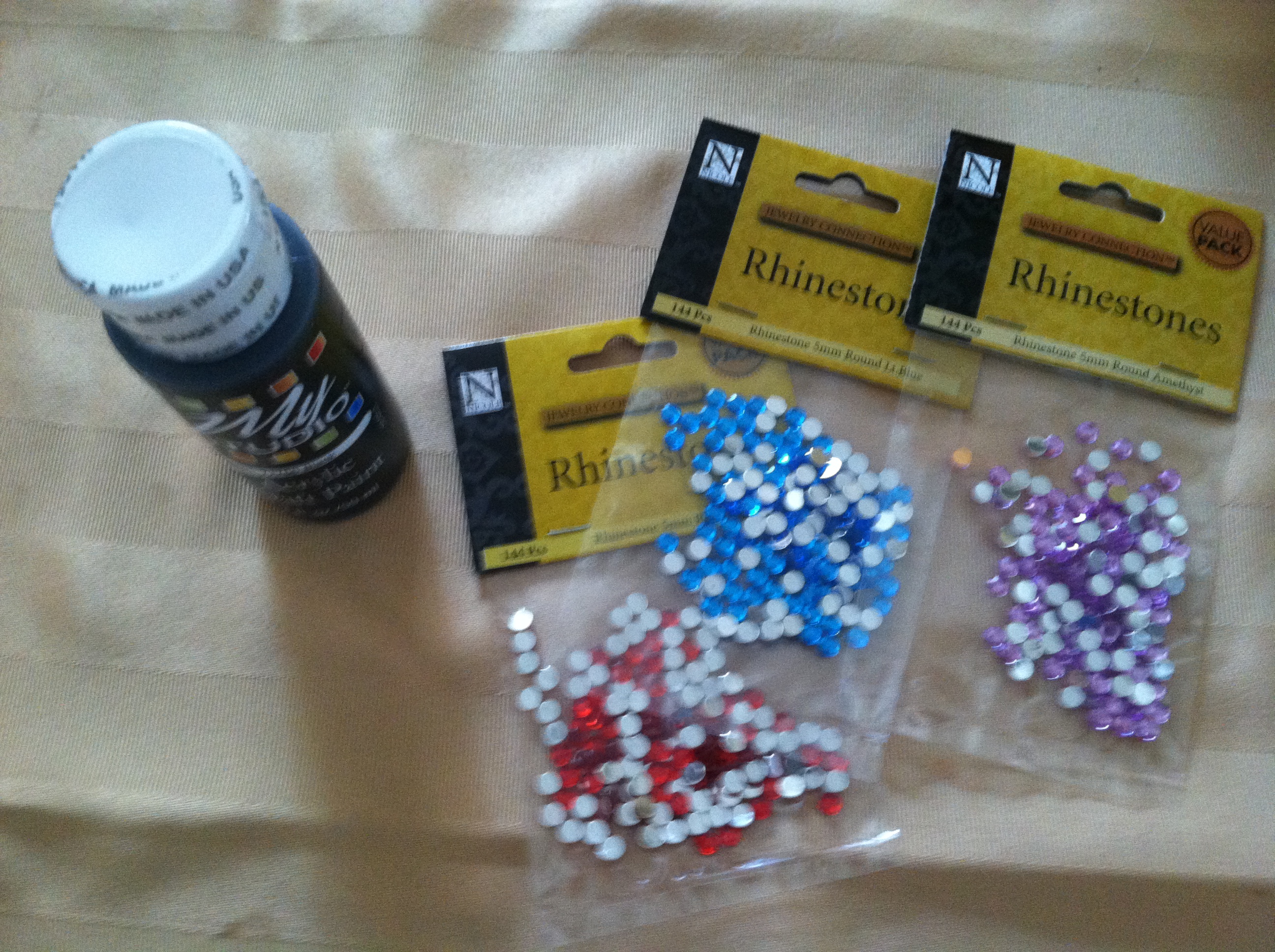 Acquire jewels. And paint. And glue. Preferably on ONE trip to the craft store and not several (which is why the glue is not present in this picture). Also, prepare to wait a very long time for the store employees to unlock the jewel case.