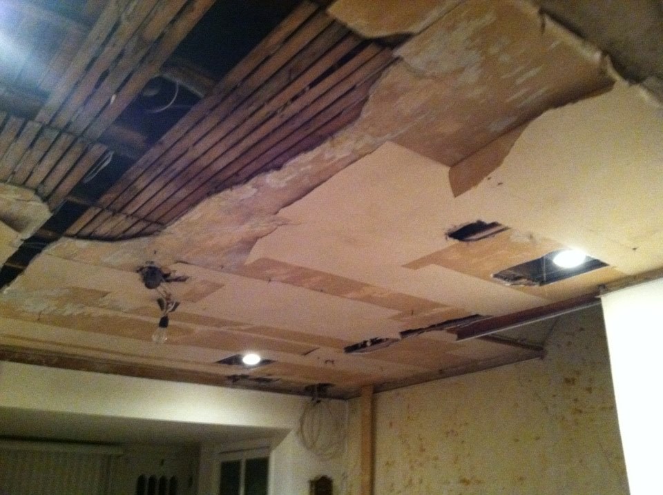 There is, as usual, a lot of discussion about the ceiling. It’s a wreck (which is why the previous owner dropped the whole thing down and covered it with Styrofoam panels) and I want it completely redone to give the rooms as much height as possible.
