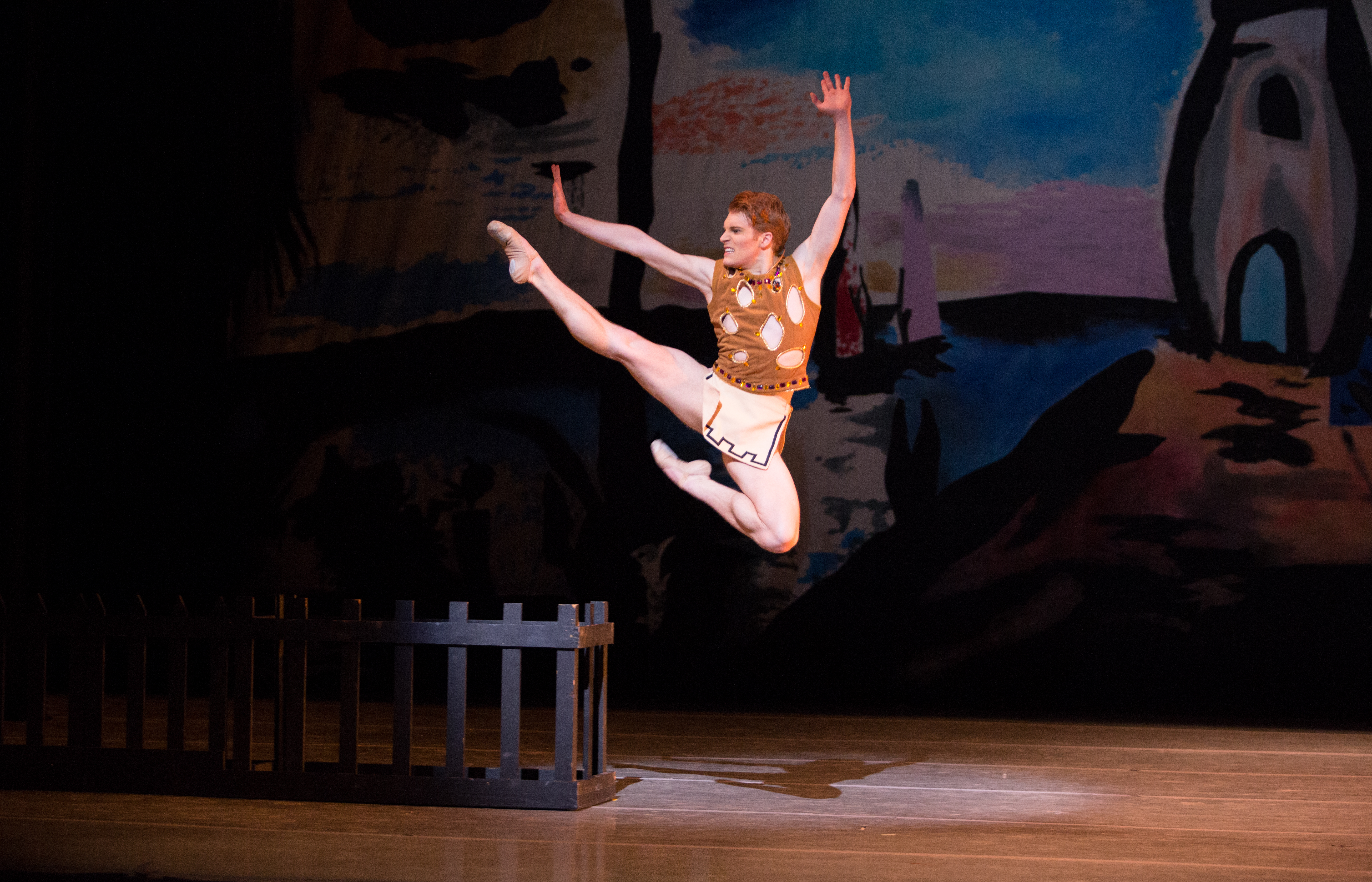 But the chocolate proves unnecessary with the final piece. The Balanchine piece, loathe though I am to admit it. The set was amazing: all dark, broad brush strokes and bright colors hinting at a 1920s version of a mythic Middle East (the work got its start with Diaghilev’s Ballets Russes) and my good friend Alexander was so very serious, so dramatic but believably so, so un-Puck like. The choreography revolves around a fence, which becomes a table, then almost the site of a crucifixion, then a boat, and finally the fence again.