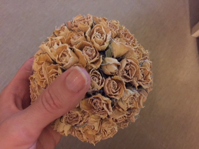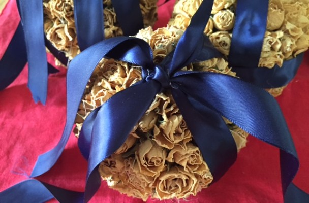 2. Glue your roses to your base. To get a nice, full pomander, keep them close together. And if you end up with a bald spot like I did because you underestimated how many roses you’d need, just whip up some fake ones out of crepe paper and paint them with nail polish (or whatever else you have laying around) so they blend in.