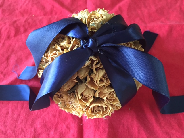 3. Tie two pieces of ribbon around your completed pomanders; it helps to glue gun the ribbons directly onto the roses to keep them in place.