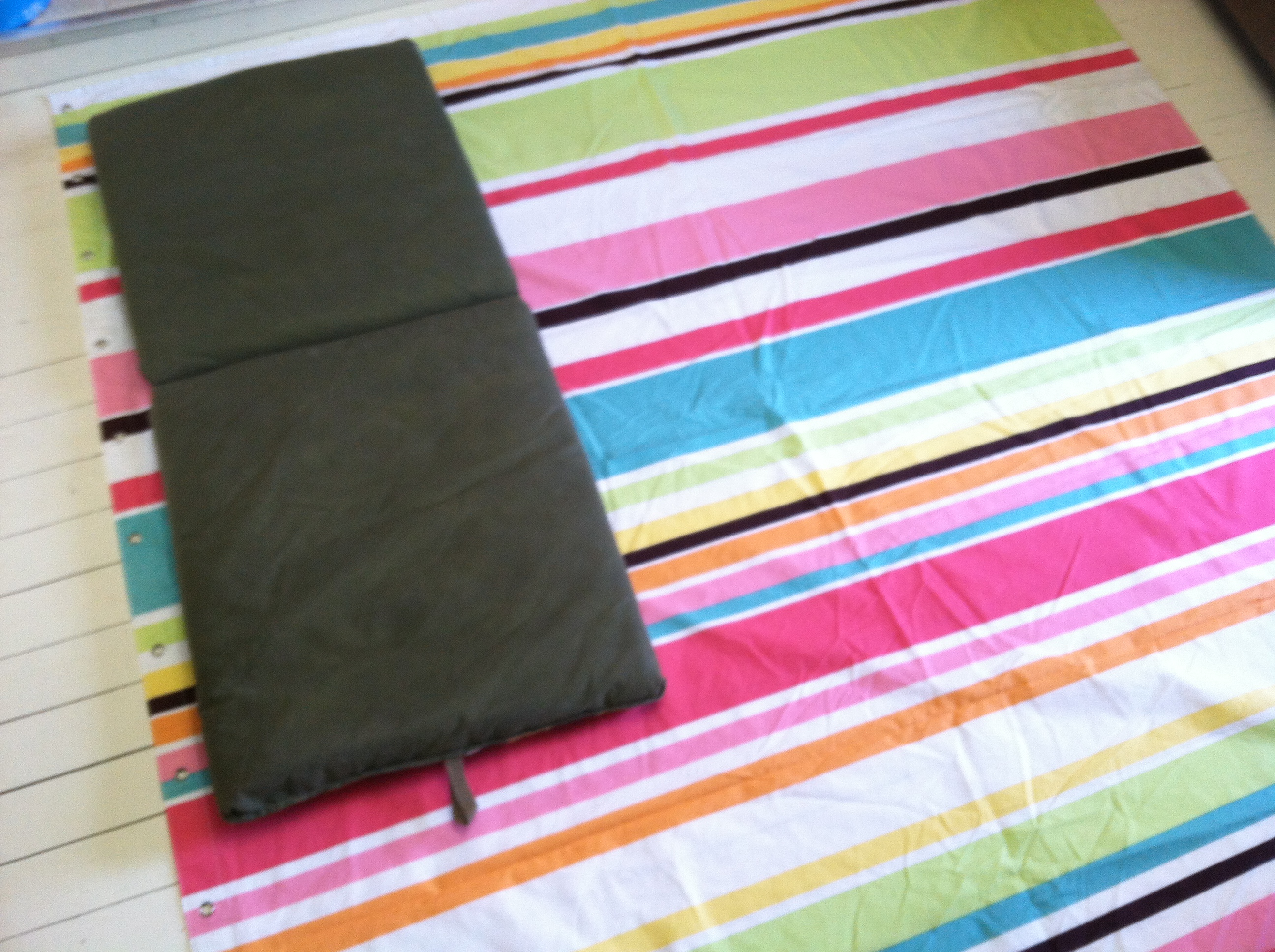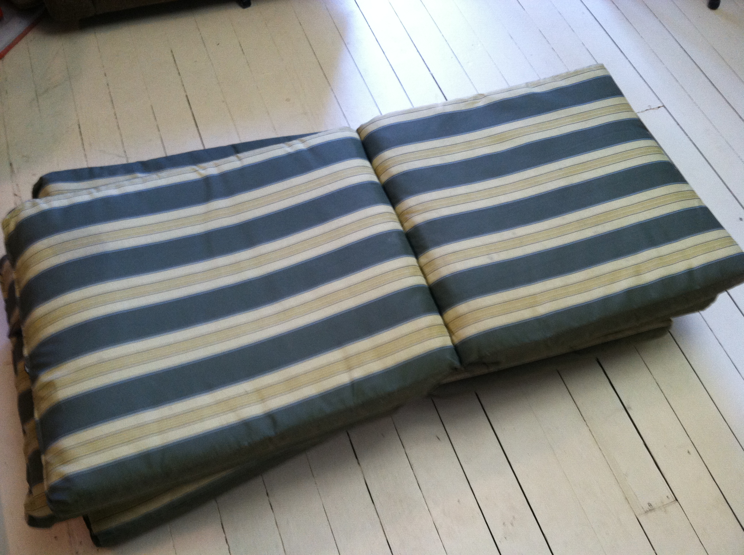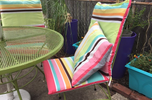 To go along with my awesome lime green patio set (which I love, PIC’s comments on the matter notwithstanding), I picked up some super cheap outdoor furniture cushions at my favorite thrift shop.