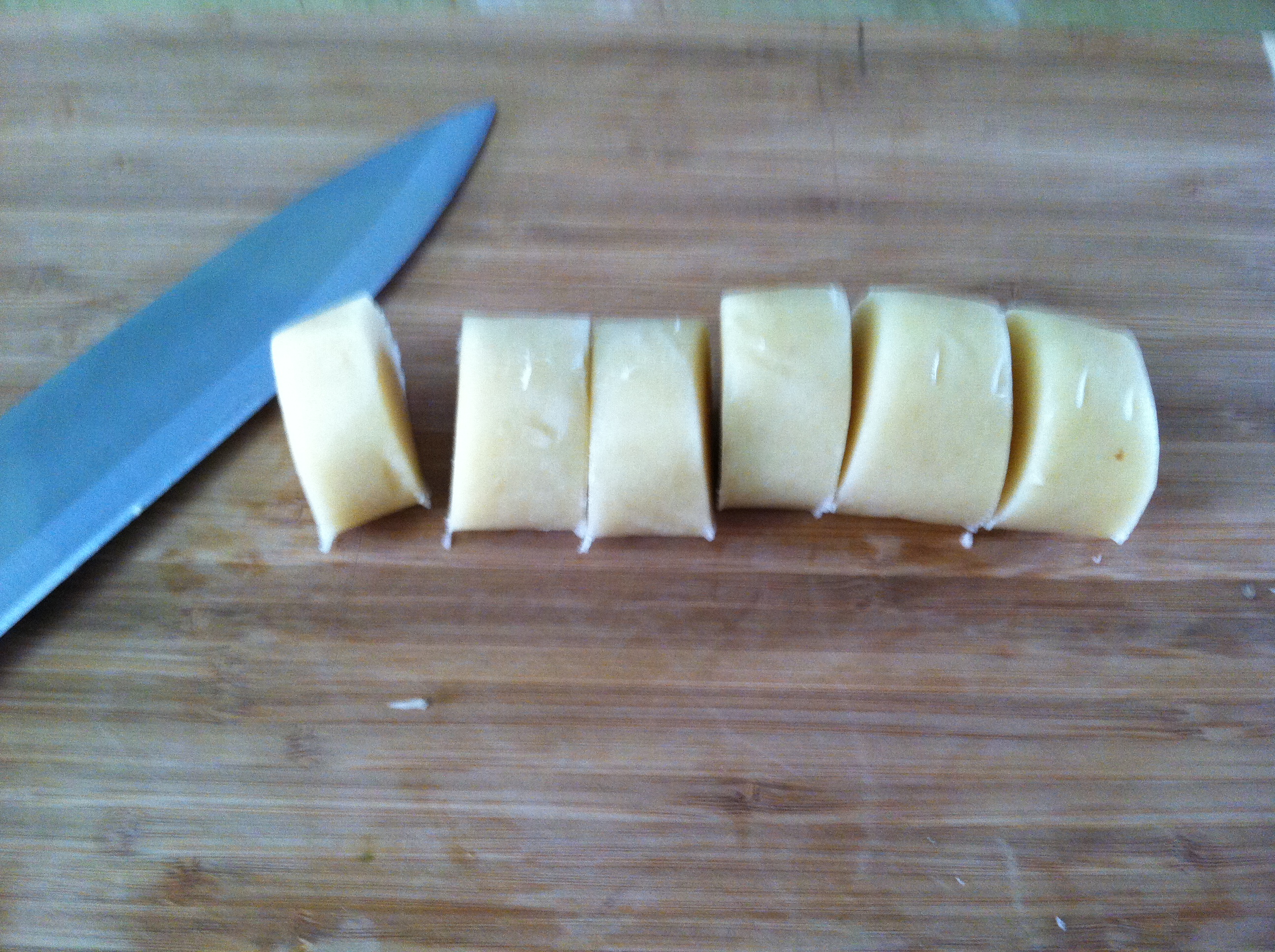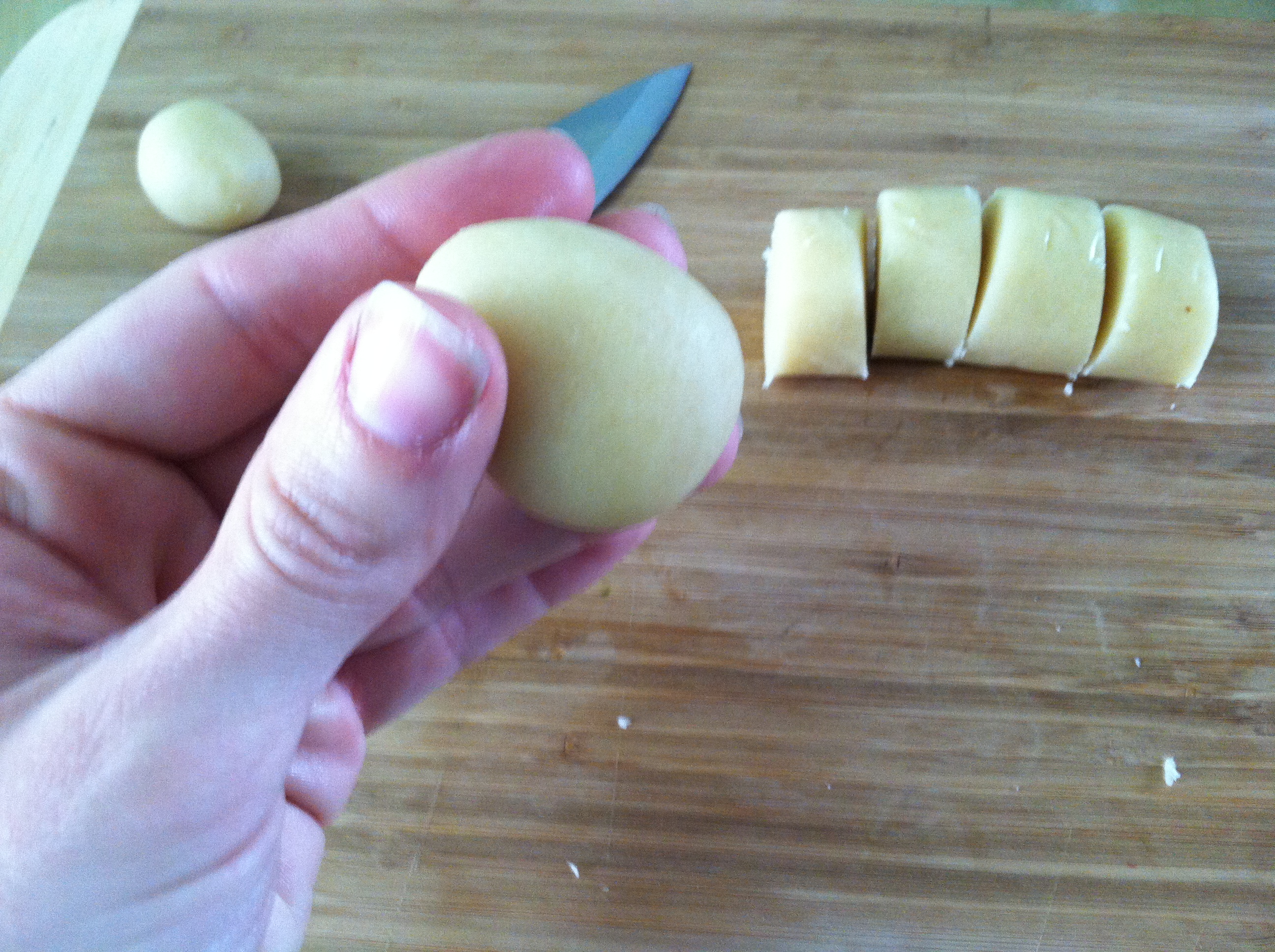 - Cut your marzipan into small pieces (you can get between 6-8 eggs out of 7 oz. of Marzipan)