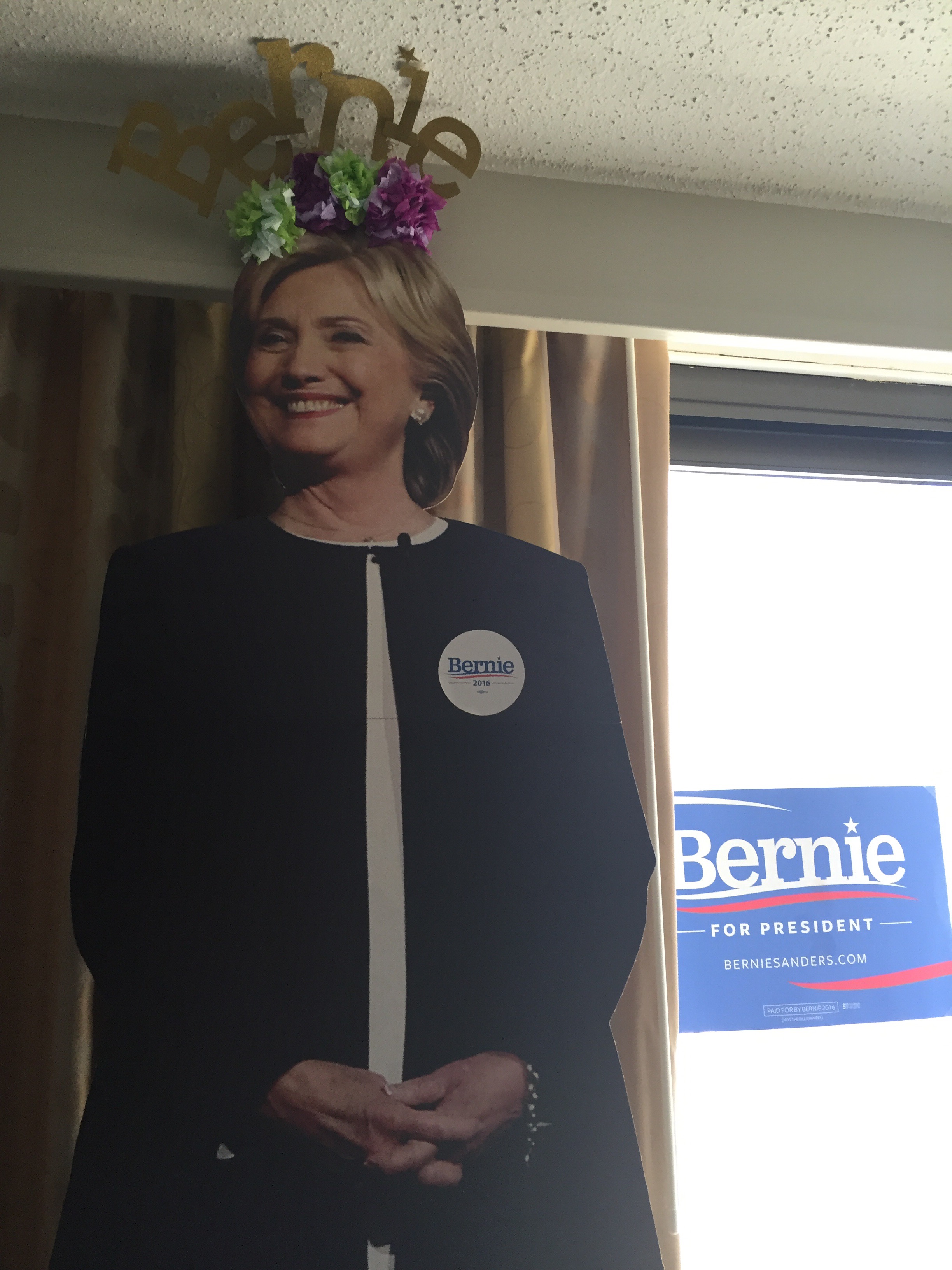 Unfortunately, being a college professor and all, I had the good sense to inform those still in college that these videos– these “Vines” or whatever they’re called– were NOT to be shared, that they were intended for private, personal therapeutic use only. And that even though one of us had successfully stolen the Hillary cardboard cut out from right outside the hotel in broad daylight thanks to my brilliant coaching (“You’re wearing a blazer, just walk confidently and no one will stop you!”), that we would not deface her in any way except to add a small and tasteful Bernie Sanders sticker to her lapel. Because, you know, RESPECT, people.