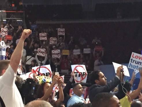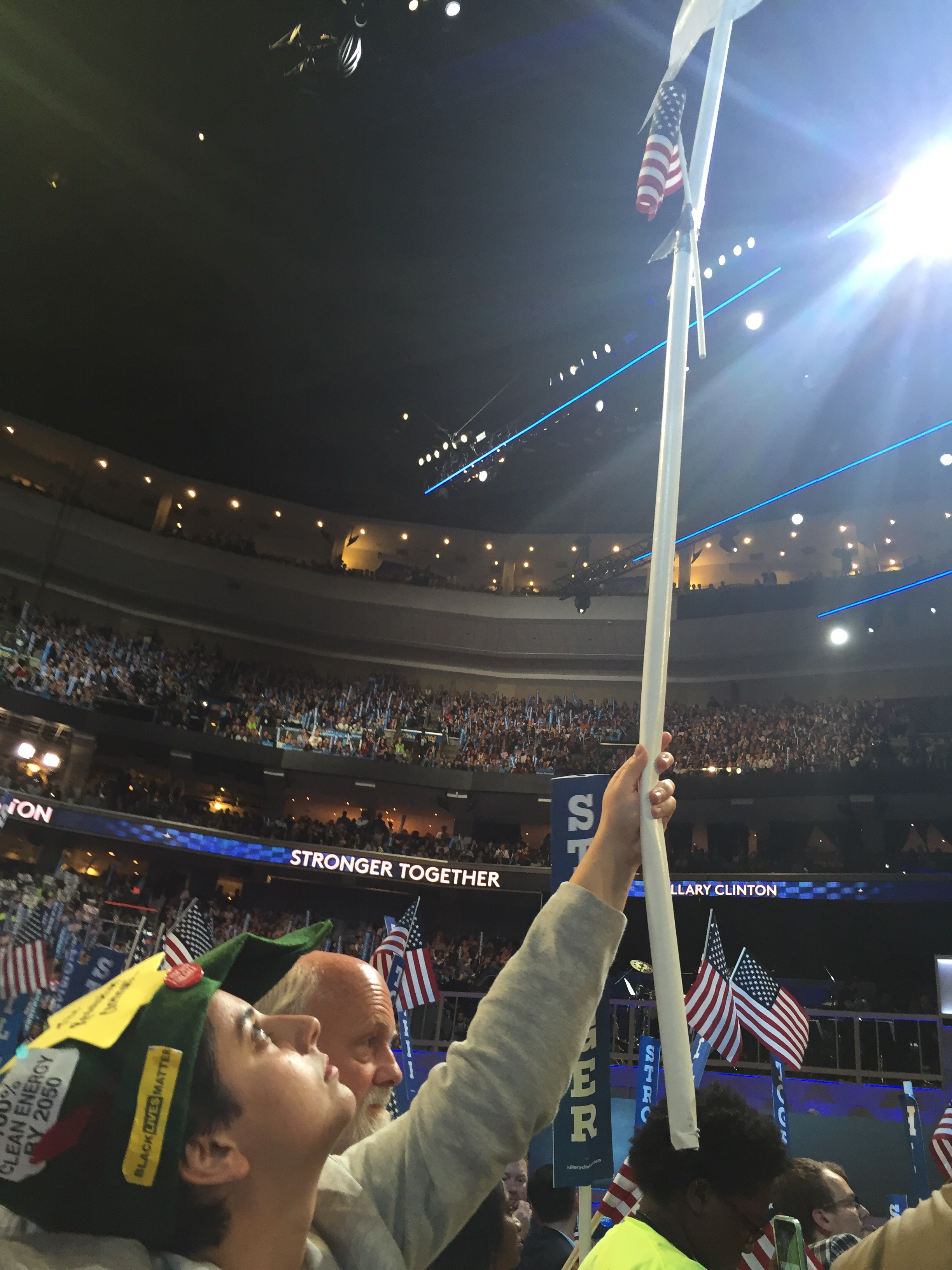 The Pennsylvania delegation wasn’t particularly well organized and although many of our members were and remain very active in a variety of grassroots organizations, we didn’t manage to plan any majorly visible actions as a state on the floor at the DNC. Some states, however, had matching T-shirts for a different issue each day of the convention: $15 Minimum Wage, Black Lives Matter, No TPP, etc. while others had glow and the dark shirts that read “Enough is Enough.” Others, like California, created a list of coordinated chants that were scheduled to begin at specific times while still others unfurled huge banners and matching signs.