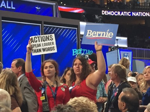 And let’s talk about the walk outs. By now, you’ve probably heard that a number of Sanders delegates walked out in protest following the roll call vote and managed to occupy the media tent before anyone knew what was going on (if you hadn’t heard about this, there’s a short and even occasionally humorous report on Gawker that’s slightly less biased than the rest.) The prevailing narrative has been that Sanders supporters (often conflated with Bernie or Busters, even though they are NOT the same thing) are a bunch of sore losers who are A) too green to understand how the political process works and B) too rude to stick around.