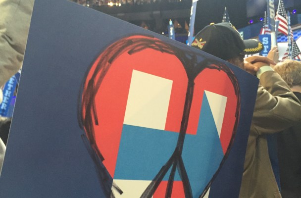 Do you remember those cute hand made Hillary signs from the second night of the DNC? The ones that made you feel all warm and fuzzy inside and think, “Isn’t that nice? She really is ‘authentic’ after all, and everyone loves her!” Well those signs weren’t hand made. I mean they were, technically, but they were hand made by DNC staffers (or campaign interns, more likely) and were distributed to delegates in the same fashion as all of the other printed signs we were instructed to wave at periodic intervals throughout the night.