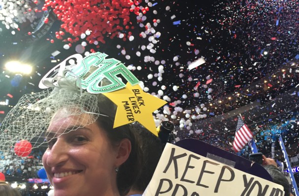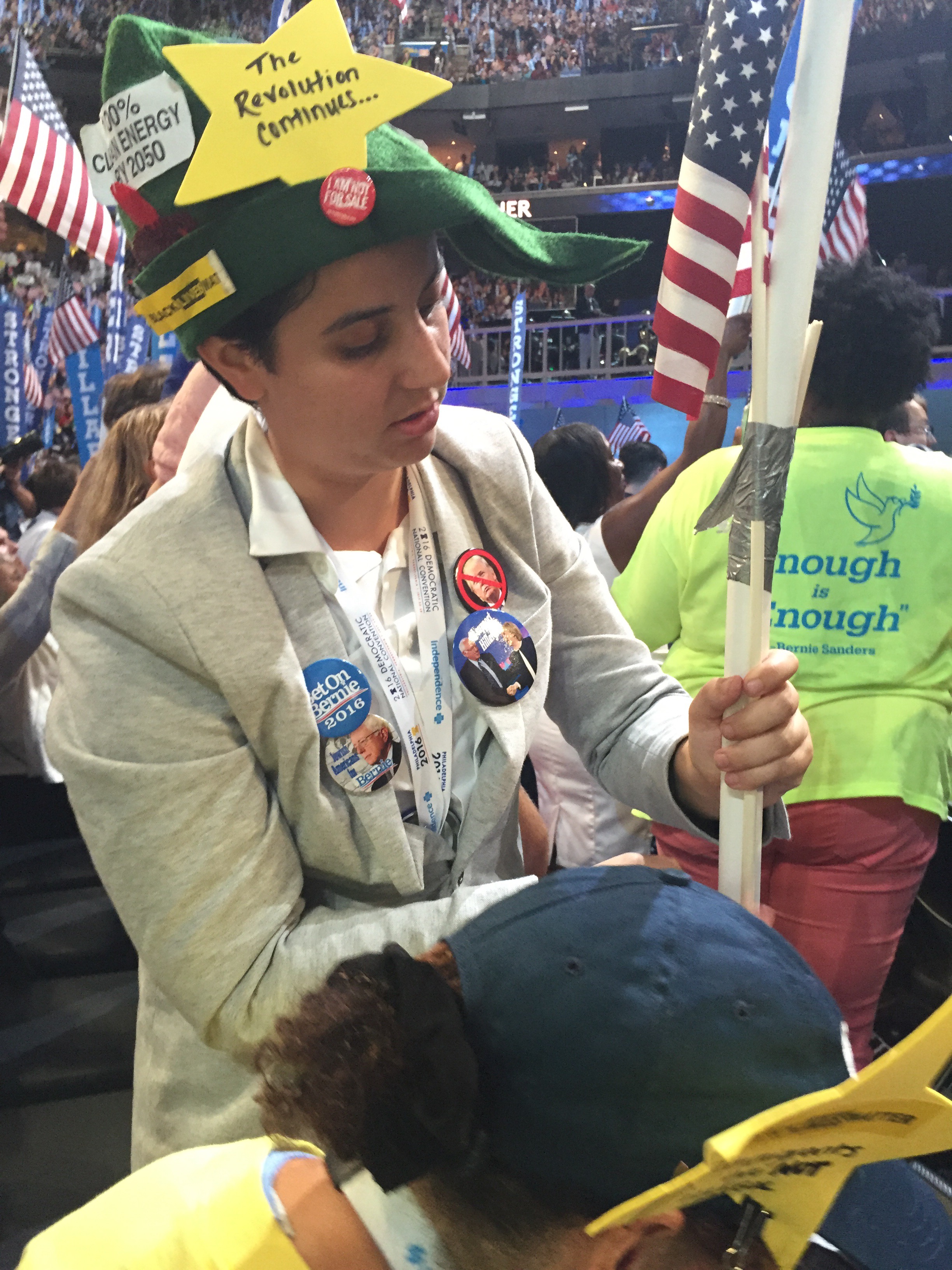 By Day #4 of the DNC, I was ready. Not only had I already set up an impressive crafting station in our hotel room but before heading down to the Wells Fargo Center that afternoon, I’d folded a Bernie Sanders lawn sign into a tiny little wad and taped it inside the pillbox of my hat.